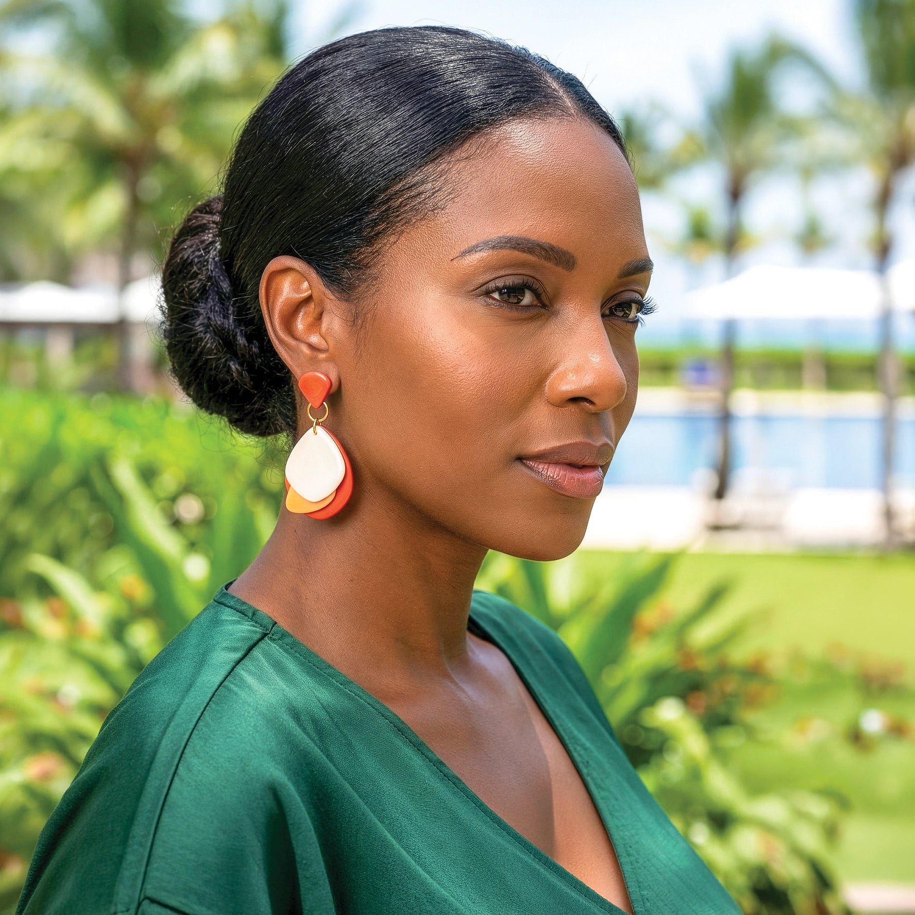 Introducing our exquisite Lauren Earrings—a dazzling pair of dangle earrings featuring a post design and adorned with three different slices of colorful tagua chips, adding a playful burst of vibrant hues and unique patterns to elevate your accessory game.