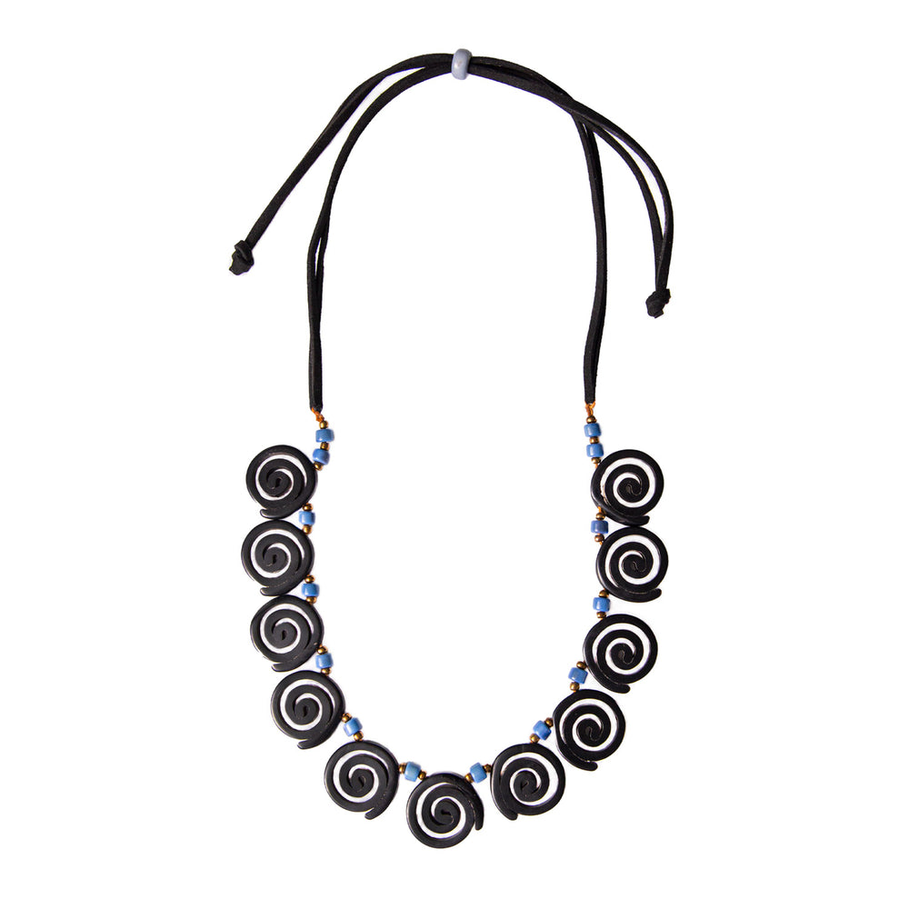 The Gary Necklace features an adjustable length from 19" to 36", allowing versatile styling options. Expertly hand-carved from tagua, its intricate swirl design showcases exceptional craftsmanship. Suspended on a durable faux leather cord, this necklace combines natural elegance with lasting comfort, making it a refined accessory for any occasion.