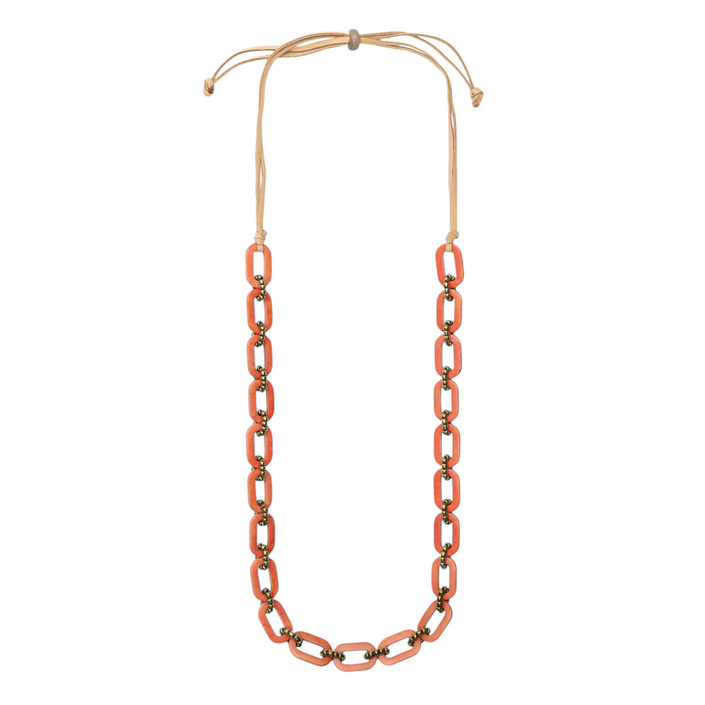 The Hali Necklace features an adjustable length from 28" to 44", expertly crafted with natural tagua and antique beads. This versatile piece combines artisanal skill with timeless materials, offering a unique accessory that adapts to your style while showcasing sustainable elegance. Perfect for those who appreciate handcrafted quality and distinctive design.