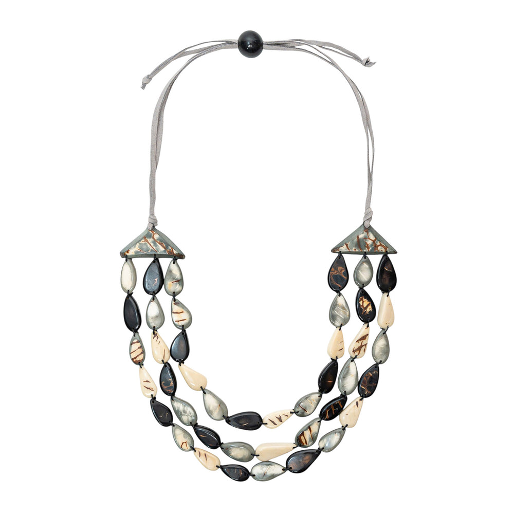 The Lys Necklace is an elegant piece ranging from 20" to 34" in length, showcasing a unique layered design crafted from tagua using leftover grain. This original creation highlights sustainable artistry while offering a sophisticated accessory that complements any outfit with natural beauty and refined craftsmanship.
