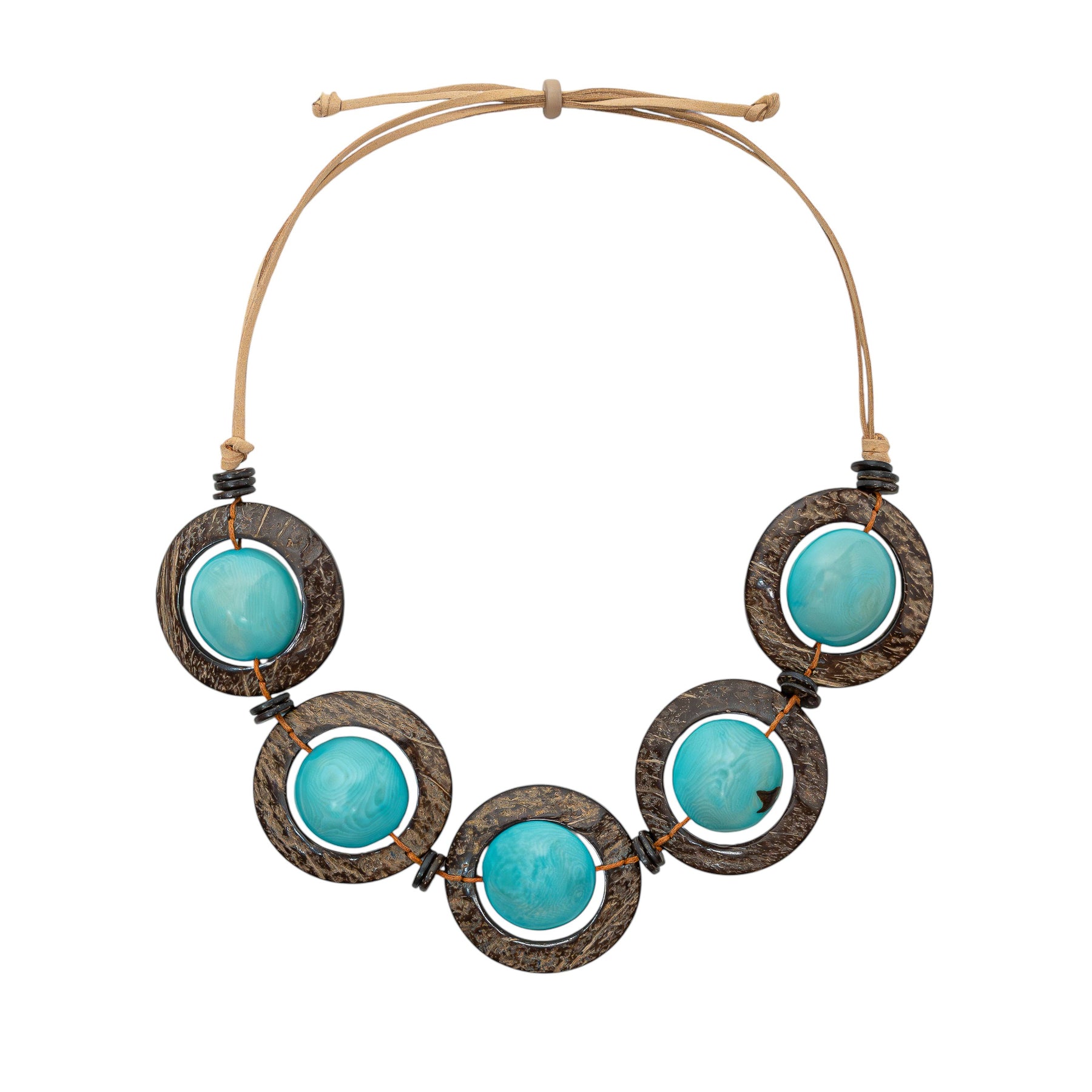 The Volcan Necklace is a bold, luxurious statement piece ranging from 18" to 30" in length. It features a striking contrast between smooth, natural tagua and recycled coconut elements, combining sustainability with sophisticated design. Perfect for those seeking an expert-crafted accessory that elevates any outfit with eco-conscious elegance.