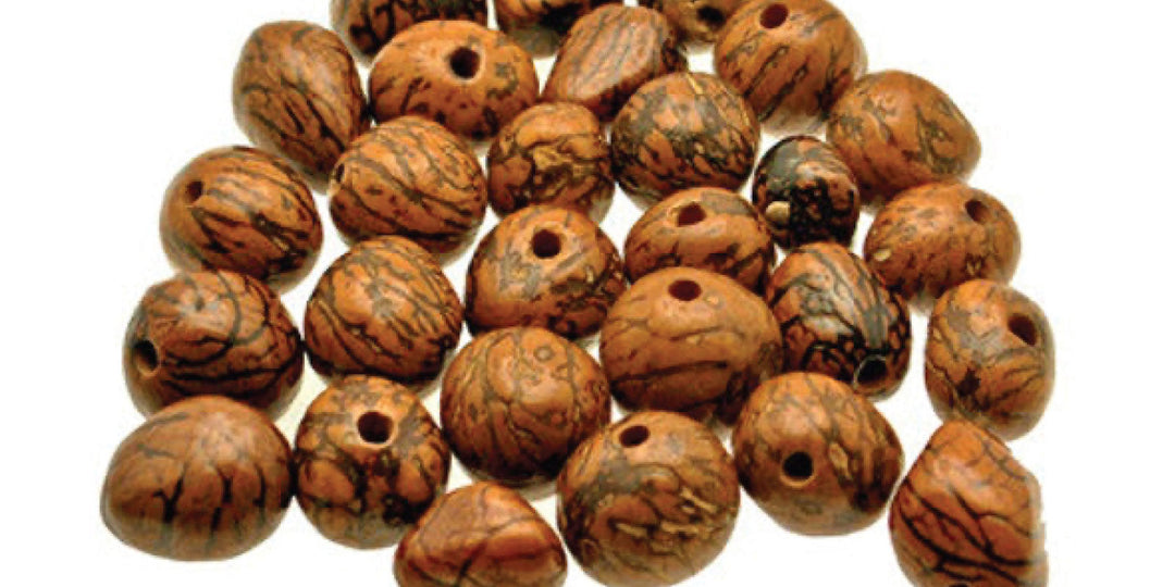 Pambil seeds are grown on canopy palm trees found in the rainforest. These seeds are gathered, dried, dyed, and polished to accent many jewelry pieces.